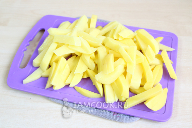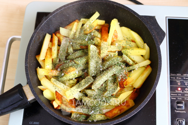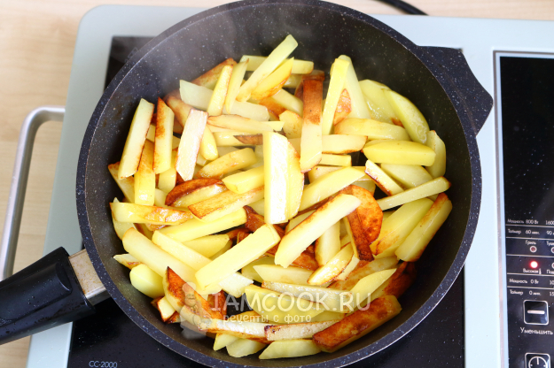 Сковороду хорошо разогреваем с растительным маслом и выкладываем брусочки. Жарим картофель пару минут, не перемешивая. Затем мешаем и снова жарим пару минут. В общем, готовим таким образом 5-7 минут, чтобы получить золотистость.