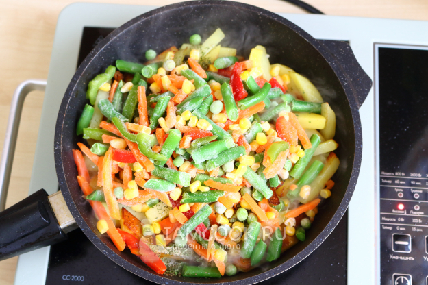 Следом добавляем мексиканскую смесь - замороженные овощи.