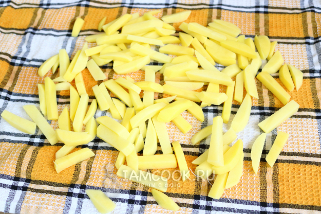 И просушиваем сухим полотенцем. Это необходимо для того, чтобы при жарке картофель приобрел красивую золотистую корочку.