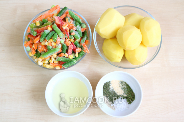 Подготовьте ингредиенты, необходимые для приготовления картошки с мексиканской смесью на сковороде.