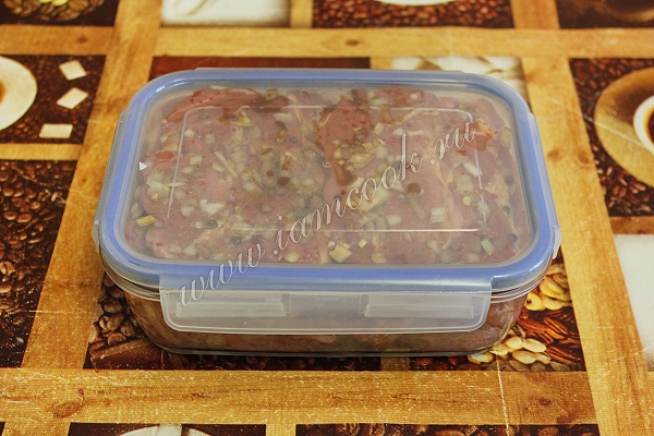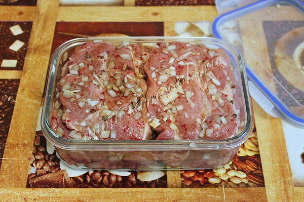 Из таких контейнеров ничего не вытекает и можно переворачивать так, чтобы стейки равномерно мариновались.