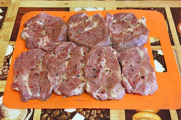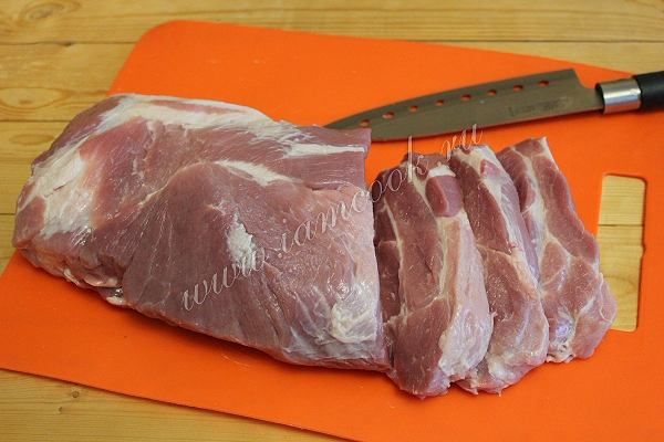 Нарежьте свиную шею поперек волокон на стейки толщиной 2-3 см.