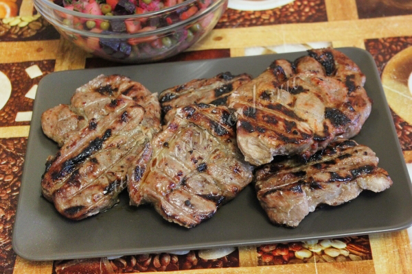 Пожалуй, самые вкусные стейки получаются на гриле, т.е. над раскаленными углями. Проще всего их приготовить из свинины и, особенно, для этих целей подходит свиная шея, желательно не подвергавшаяся заморозке. Мясо свинины с шеи мягкое с тонкими жировыми прожилками и оно практически не требует дополнительного длительного маринования. Поэтому используйте любой состав специй по настроению: любые смеси душистых и острых перцев и ароматных трав (базилик, прованские травы, хмели сунели и т.д.), всевозможные пряности, соусы вустреский, соевый, а если уксус - то только бальзамический.