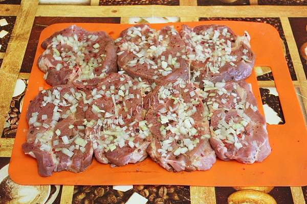 Лук мелко нашинкуйте и поместите его на стейки со всех сторон.