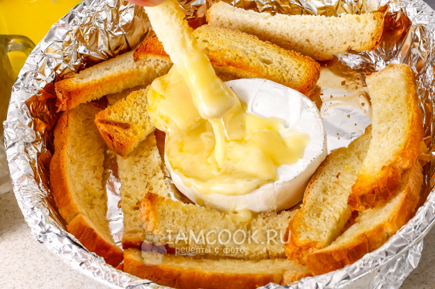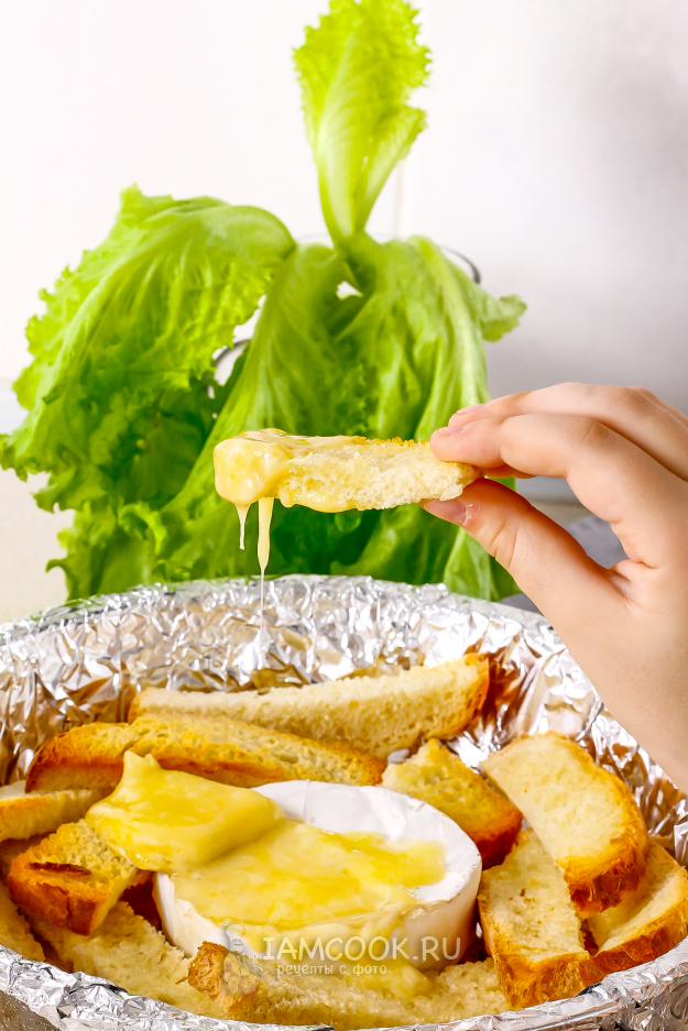 Извлеките форму из духовки и разрежьте или срежьте верхнюю шляпку сыра. Возьмите гренку и обмакните ее в расплавленный сыр, продегустируйте.