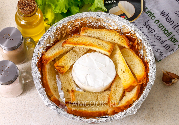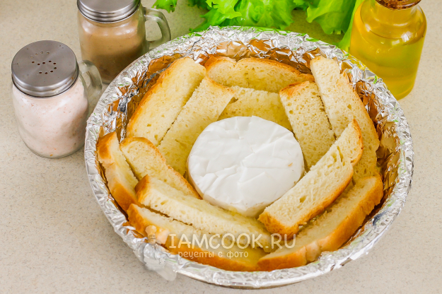 В середину формы для запекания выложите шайбу сыра. Вокруг него распределите ломтики хлеба. Желательно одним слоем, чтобы все гренки успели подрумяниться.