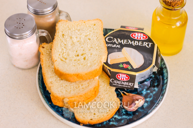 Подготовьте необходимые ингредиенты для запекания камамбера в духовке с гренками. Камамбер приобретите только в небольших шайбах - они покрыты белой съедобной плесенью. Сорт хлеба роли не играет, можно купить и белый, и ржаной, и бородинский: чиабатту, багет, пышный лаваш.