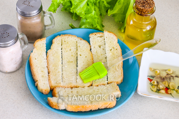 Ломтики хлеба нарежьте любым удобным для вас способом, но не мелко. Обмажьте их чесночным маслом и посолите.
