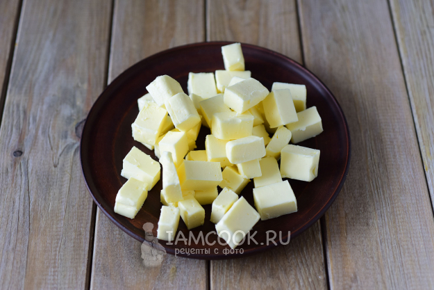 Масло нарежем кубиками среднего размера, выложим на тарелку и отправим в морозильную камеру на 15-20 минут.