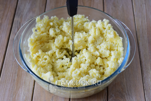 Выложим картофель в просторную миску и истолчем толкушкой в пюре.