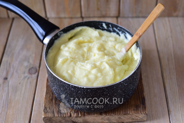 Приготовленное пюре выложим в сотейник с толстым дном и поставим на маленький огонь. Закинем в сотейник с пюре несколько кусочков замороженного масла и вмешаем их в картофель энергичными движениями ложкой. Как только вмешаем первую партию масляных кусочков, добавим следующую и также вмешаем. Работать ложкой надо очень активно, не допуская появления масляных лужиц от растаявшего масла. Когда масло все закончится, консистенция пюре уже станет мягкой и эластичной.