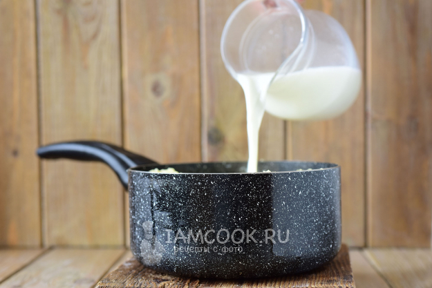 Молоко доведем до кипения в кастрюльке. Не снимая сотейник с картофельным пюре с плиты (я сняла, лишь чтобы сфотографировать), зальем горячее молоко порциями, чтобы контролировать консистенцию итогового пюре. Молоко также вмешаем в картофельную массу, добавив соль. Уровень огня оставляем минимальным.
