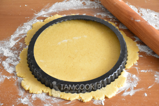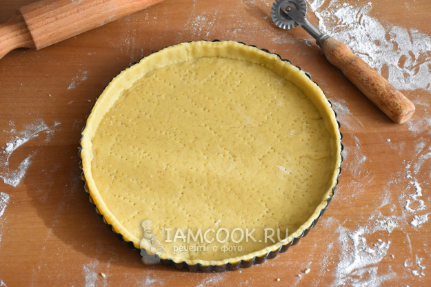 На присыпанной мукой поверхности раскатать 3/4 теста в круг. Вырезать круг диаметром на 2-3 см больше вашей формы для выпечки. Можно вырезать круг по форме и затем отдельно сформировать бортик.