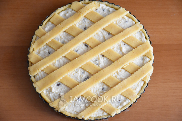 Аккуратно выложить полоски из теста поверх крема из рикотты в виде решетки.