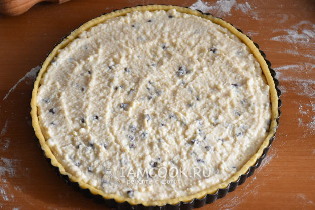 Форму для выпечки смазать сливочным маслом и присыпать мукой. Излишки муки стряхнуть. Я использую разъемную форму для кростаты диаметром 24 см. Выложить тесто в форму и наколоть вилкой.
