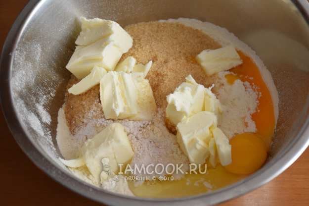 Добавить кусочки сливочного масла, сахар, яйцо, желток и щепотку соли.