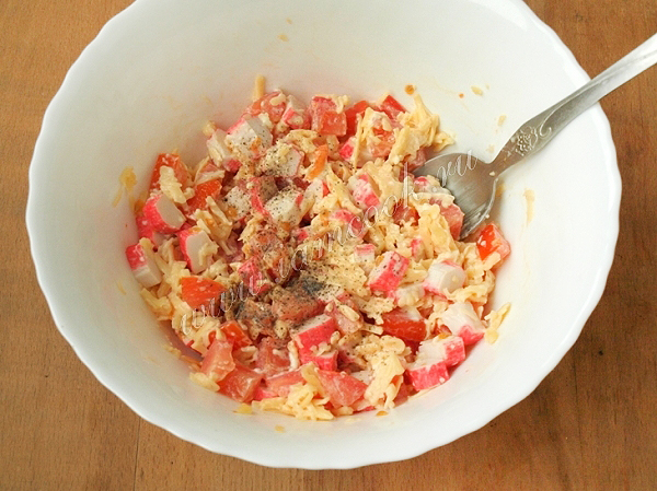 Добавить по вкусу майонез и чёрный перец. Хорошо перемешать.Если требуется, то салат посолить.