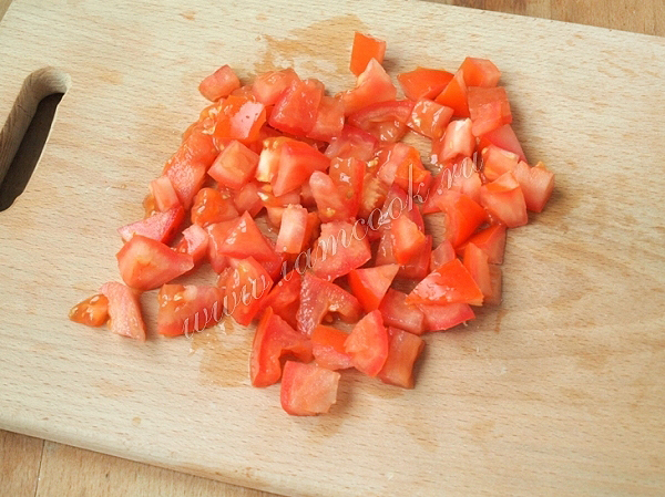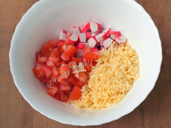 Соединить в миске крабовые палочки с помидорами и сыром. Чеснок пропустить через пресс.