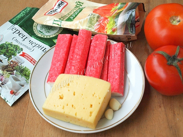 Для приготовления салата нам понадобятся крабовые палочки, помидоры, твёрдый сыр, чеснок, майонез и чёрный перец.