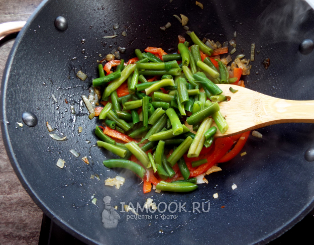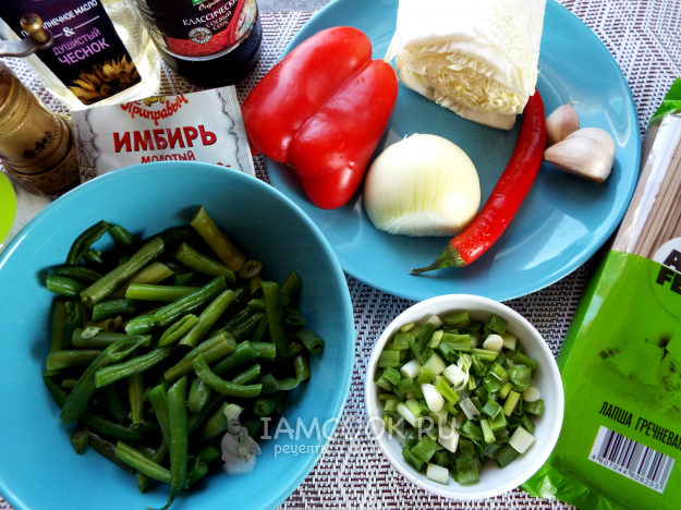 Возьмите продукты для приготовления лапши вок с фасолью (стручковой) и овощами.