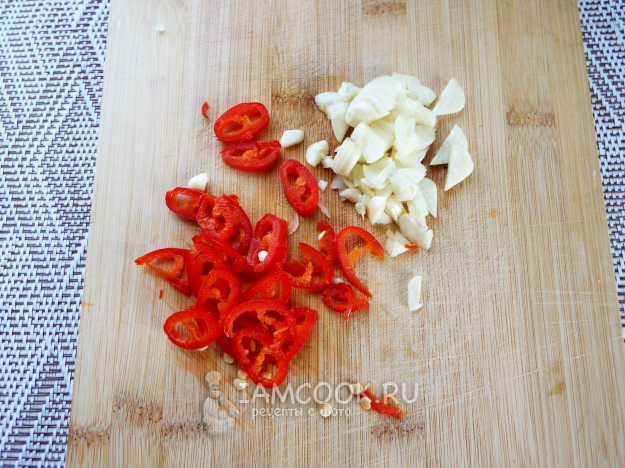 Перец чили нарезать тонкими колечками, чеснок - лепестками.
