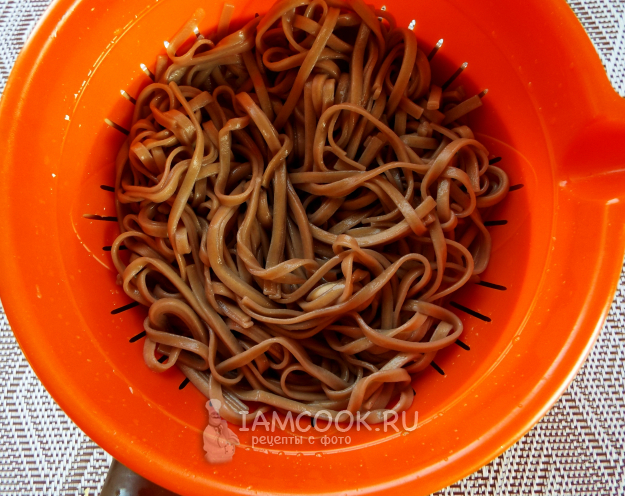 Лапшу отварить согласно инструкции. Промыть в холодной воде.