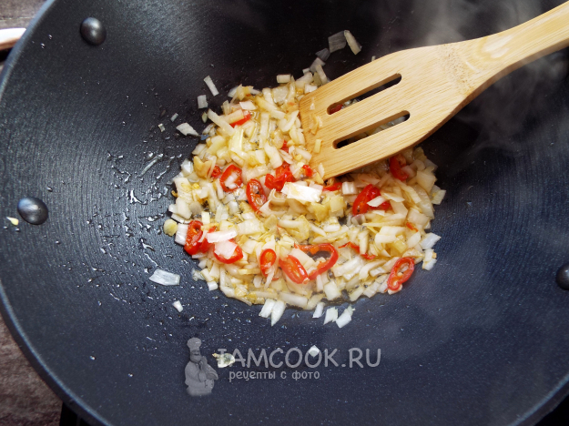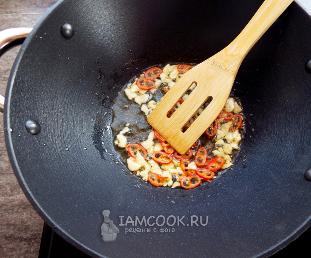 В воке накалить масло до легкого дымка. Отправить в вок чили и чеснок. Перемешать.