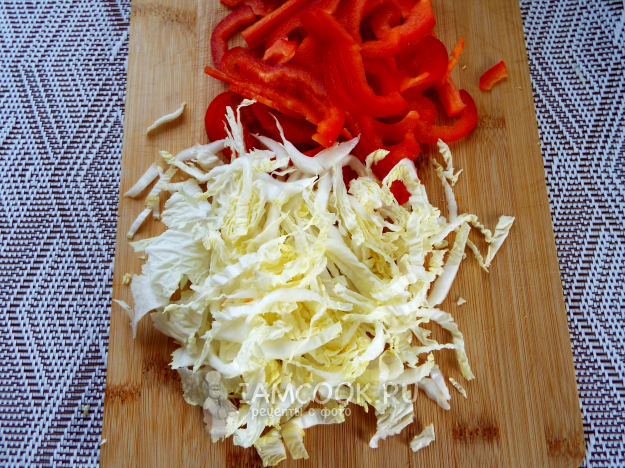 Перец и капусту нетолстыми полосками.