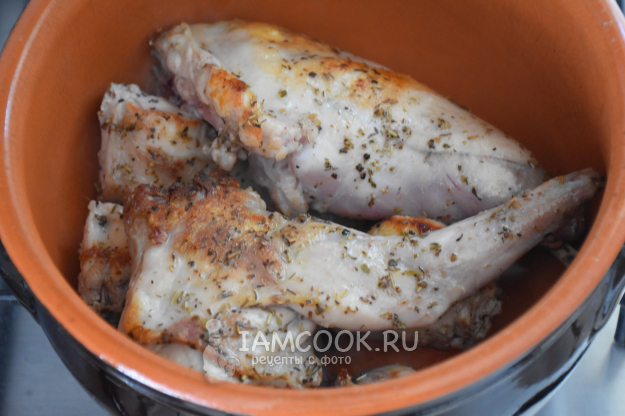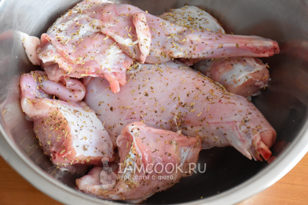 Мясо кролика натереть солью, молотым перцем и прованскими травами.