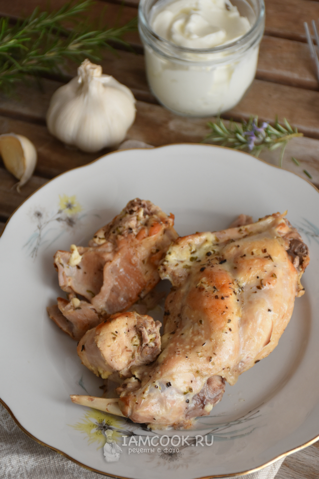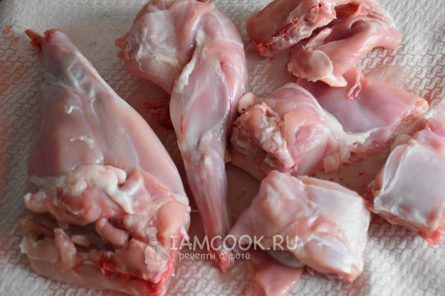 Тушку кролика помыть, обсушить бумажным полотенцем и разрезать на порционные куски.