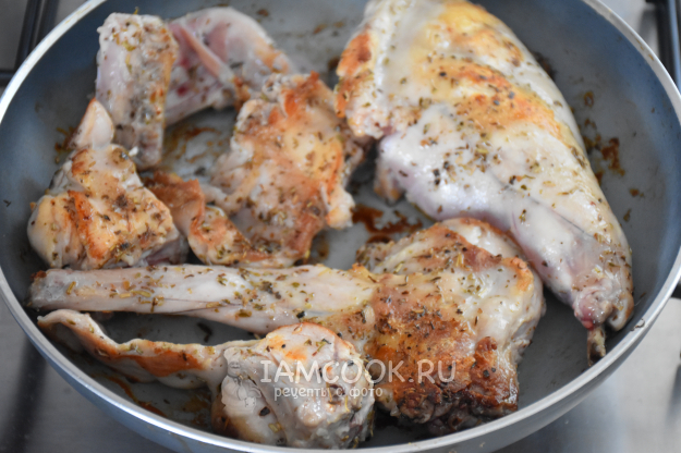 В сковороде разогреть оливковое масло и обжарить кролика до золотистой корочки на сильном огне несколько минут.