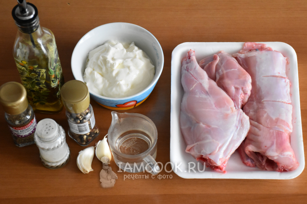 Для приготовления тушеного кролика в сметане с чесноком нам понадобятся следующие ингредиенты.