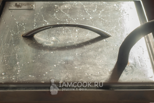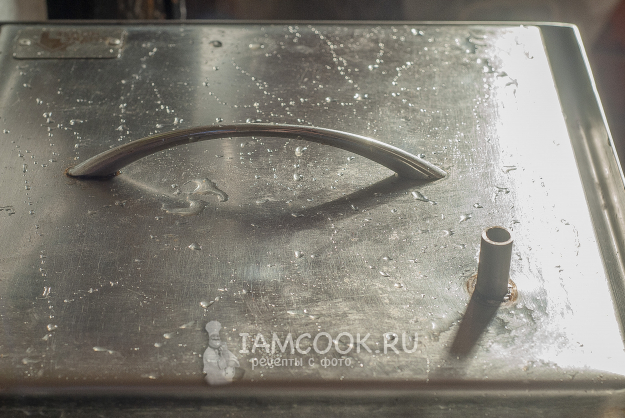 В желобок наливаем воду, накрываем коптильню крышкой и ставим на огонь. Как только из штуцера показался дымок, надеваем шланг и выводим в окно или в вытяжку. Засекаем время.