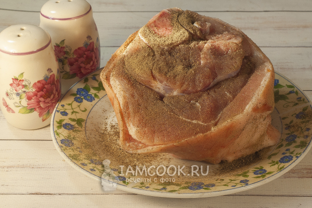Рульку промоем, поскоблим ножом. Если есть необходимость - обсмалим. Пересыплем солью и черным перцем, можно натереть чесноком, пропущенным через чесночницу. Я сегодня ограничусь перцем.