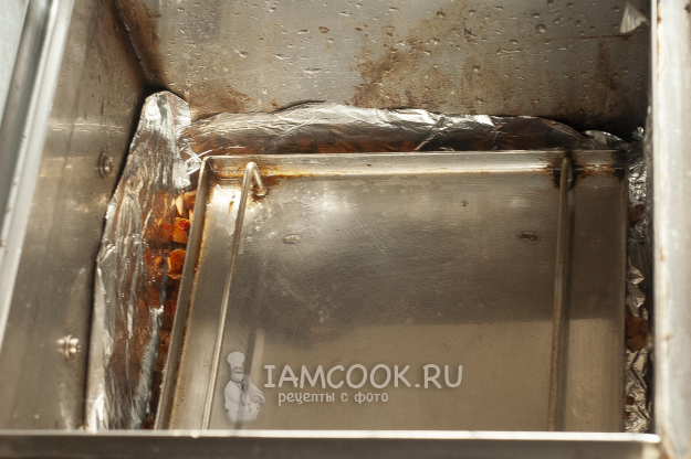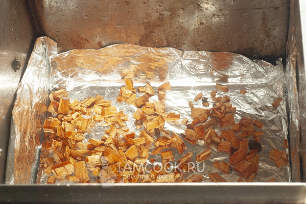 Подготовим коптильню. Я застилаю дно и бока коптильни фольгой, чтобы меньше пачкалась. Этого можно и не делать. На дно выкладываем щепу.