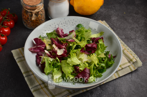 В миску положите салатный микс. Предварительно крупные листья порвите руками или нарежьте.