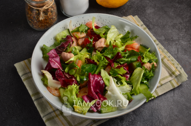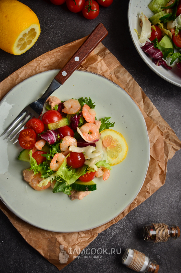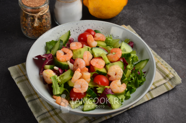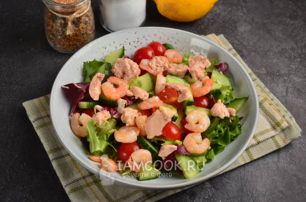 Подавать салат с печенью трески и креветками лучше сразу после заправки.
