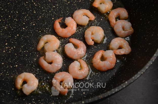 Креветок обжарьте с каждой из сторон по минуте, на подсолнечном или оливковом масле.