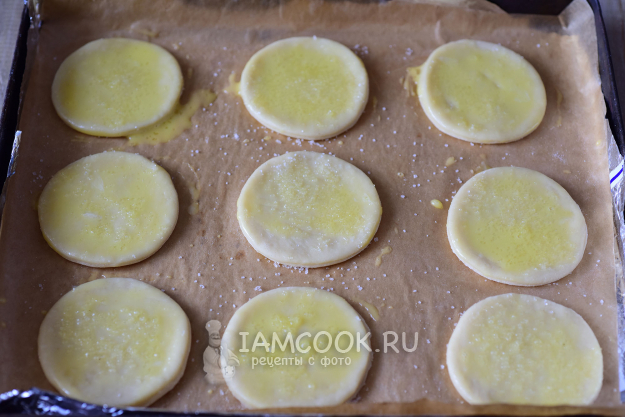 Все заготовки печенья выложим на противень, застеленный пергаментом для выпекания. Каждую заготовку смажем смесью яичного желтка и теплой воды, воспользовавшись кондитерской кистью. Присыплем будущее печенье сахаром.