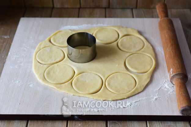 Рабочую поверхность присыплем небольшим количеством муки и раскатаем скалкой тесто в пласт толщиной в 3-4 мм. Вырубим заготовки печенья любой формочкой, у меня - кондитерское кольцо диаметром 7 см.