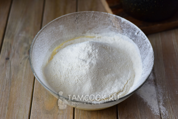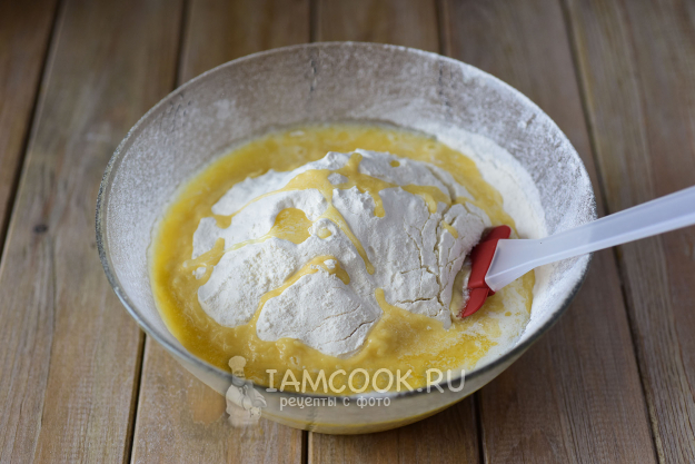 В миску к творожной смеси просеем муку с разрыхлителем, добавим соль.