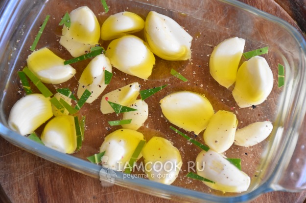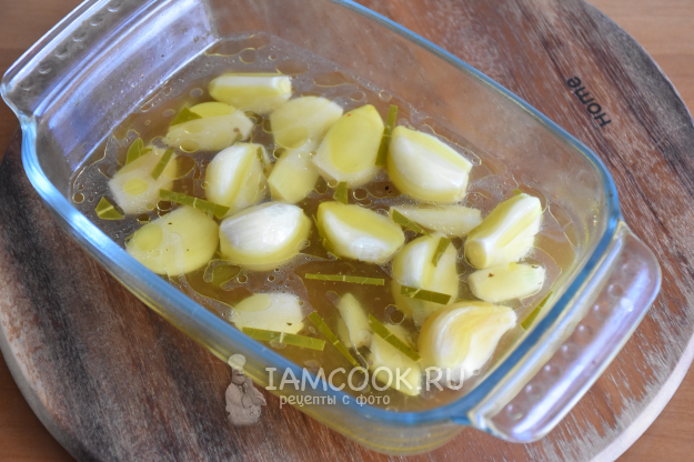 Выложить чеснок в форму для запекания, залить белым сухим вином, сбрызнуть оливковым маслом, посолить и поперчить по вкусу, добавить лавровый лист.