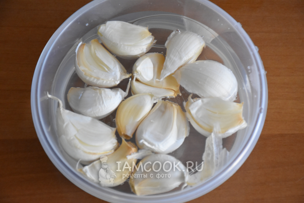 Сначала очистим чеснок. Для этого надо положить чеснок в контейнер, залить водой и хорошо встряхнуть. Таким образом кожицу можно будет легко снять.