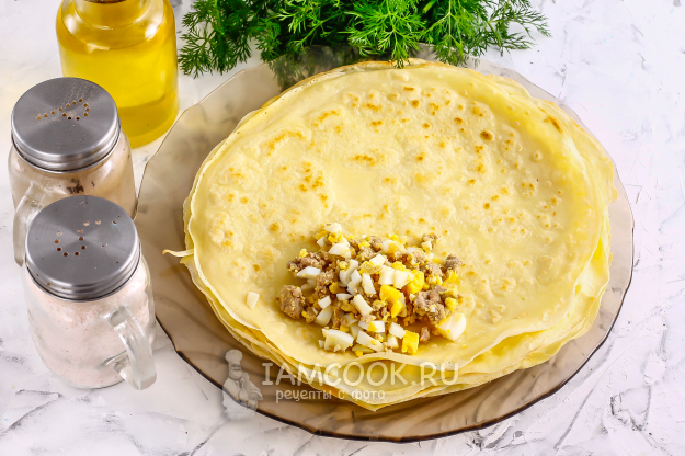 Выложите 1,5 ст.л. начинки на блин и сверните рулетиком. Так же начините и остальные блины.