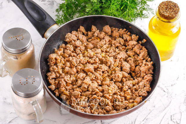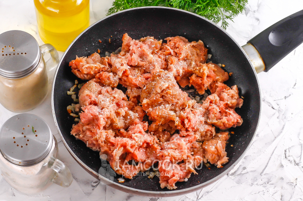 Выложите мясной или куриный фарш, перемешайте и обжарьте в течение 15 минут. Посолите и поперчите.