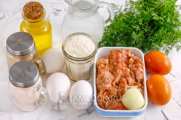 Возьмите необходимые ингредиенты для приготовления румяных блинов с фаршем и яйцом в начинке.