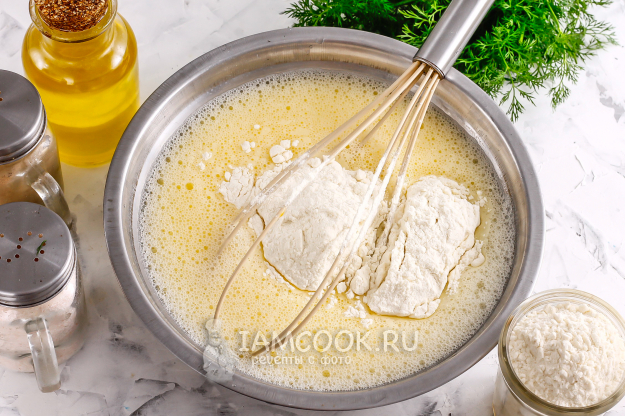 Всыпьте просеянную пшеничную муку, вмешайте ее венчиком, не взбивая, чтобы не образовать комочки. Влейте 2 ст.л. растительного масла и перемешайте. Оставьте тесто в покое на 20 минут.