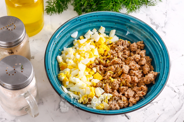 Очистите отварные куриные яйца от скорлупы и промойте в воде. Нарежьте мелкими кубиками и смешайте с обжаренным мясным фаршем. На этом этапе в начинку можно добавить измельченный зеленый лук и майонез.