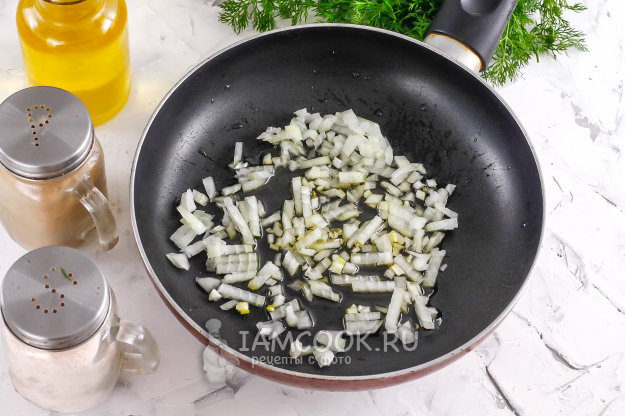 В это время очистите луковицу, разрежьте ее пополам. Половину овоща нарежьте мелкими кубиками и отпассеруйте в оставшемся растительном масле на сковороде примерно 3-4 минуты, включив умеренный нагрев.