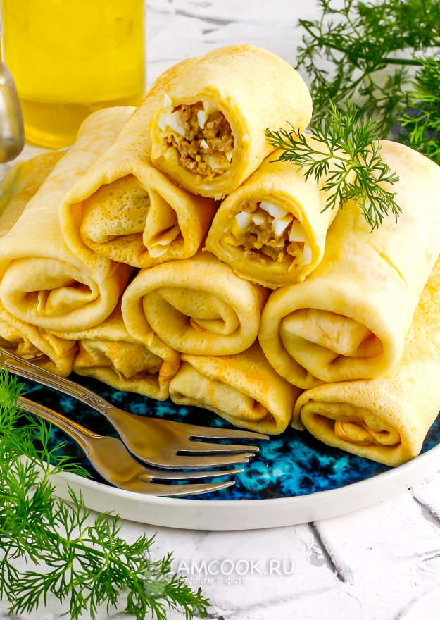 К столу блины с фаршем и яйцом подайте в теплом виде со сметаной или другим соусом, горячими напитками: чаем, молоком.